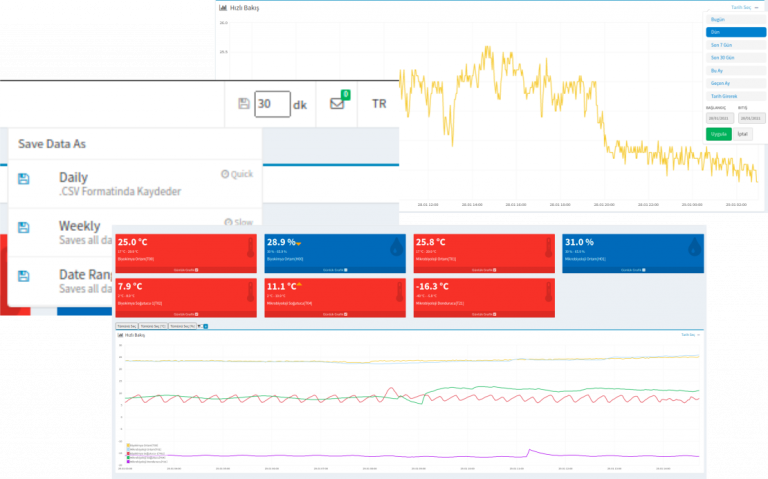 In addition to offering the user the opportunity to monitor the humidity and temperature values of the environment in real time through the specially developed interface, it has a 6-month storage feature with 2-minute periods. Intelligent Humidity Temperature Sensor RF Set, which also offers cloud storage data analysis and graphical access feature to the user, is a product that stands out on the basis of price performance for humidity temperature monitoring.